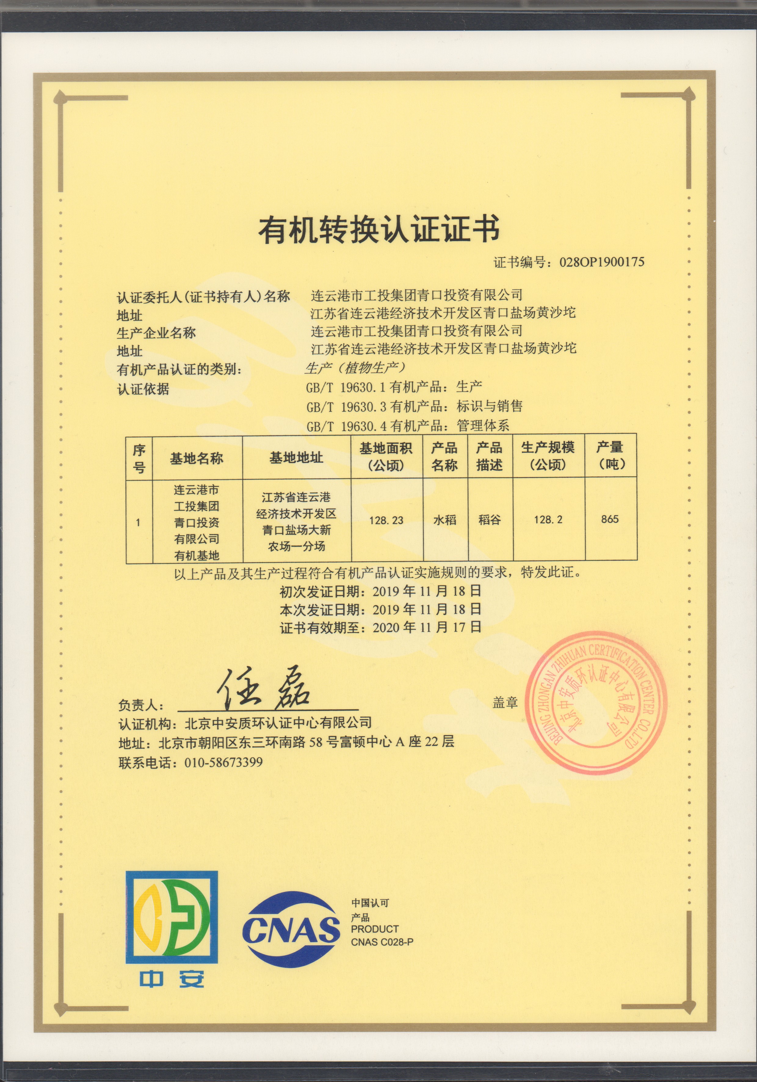 1125日上午,青口投資公司種植的“南粳9108”有機大米經過嚴格的檢測和審核,榮獲北京中安質環認證中心頒發的有機轉換認證證書。