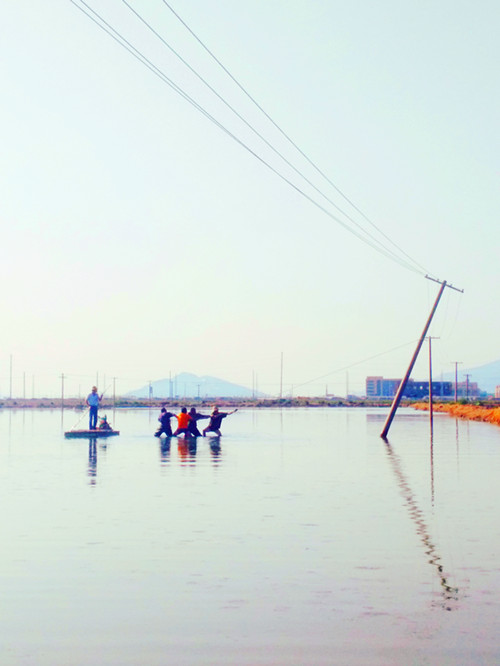 9月20日,該所組織人員進行搶修。搶修人員經過現場勘查后,發現隱患地點處于池塘中,搶修車輛等大型工器具無法到達,只能靠人工搶修。在與魚塘養殖戶協商后,俞德春、楊祖加、楊新軍等搶修人員在對低壓線路采取停電、驗電、掛接地等安全措施后,利用小木船來回穿梭、傳送材料,再跳入沒腿深的水里,將電桿扶正、加固。此時,水面上的船、水中的人、拖拽的線路成了鏡頭中的新聞亮點。最后在經過半個多小時的特色搶修后,成功恢復供電。(錢明華)