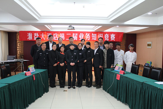 為了進一步提高酒店全體員工安全生產(chǎn)意識以及酒店專業(yè)業(yè)務(wù)水平,淮鹽大酒店于11月19日舉行第二屆“酒店綜合知識競賽”,酒店總經(jīng)理伏運余、副總經(jīng)理楊帆、質(zhì)檢經(jīng)理周洪近、餐飲經(jīng)理郭天麗擔任裁判,現(xiàn)場氣氛非常活躍,競賽取得圓滿成功。