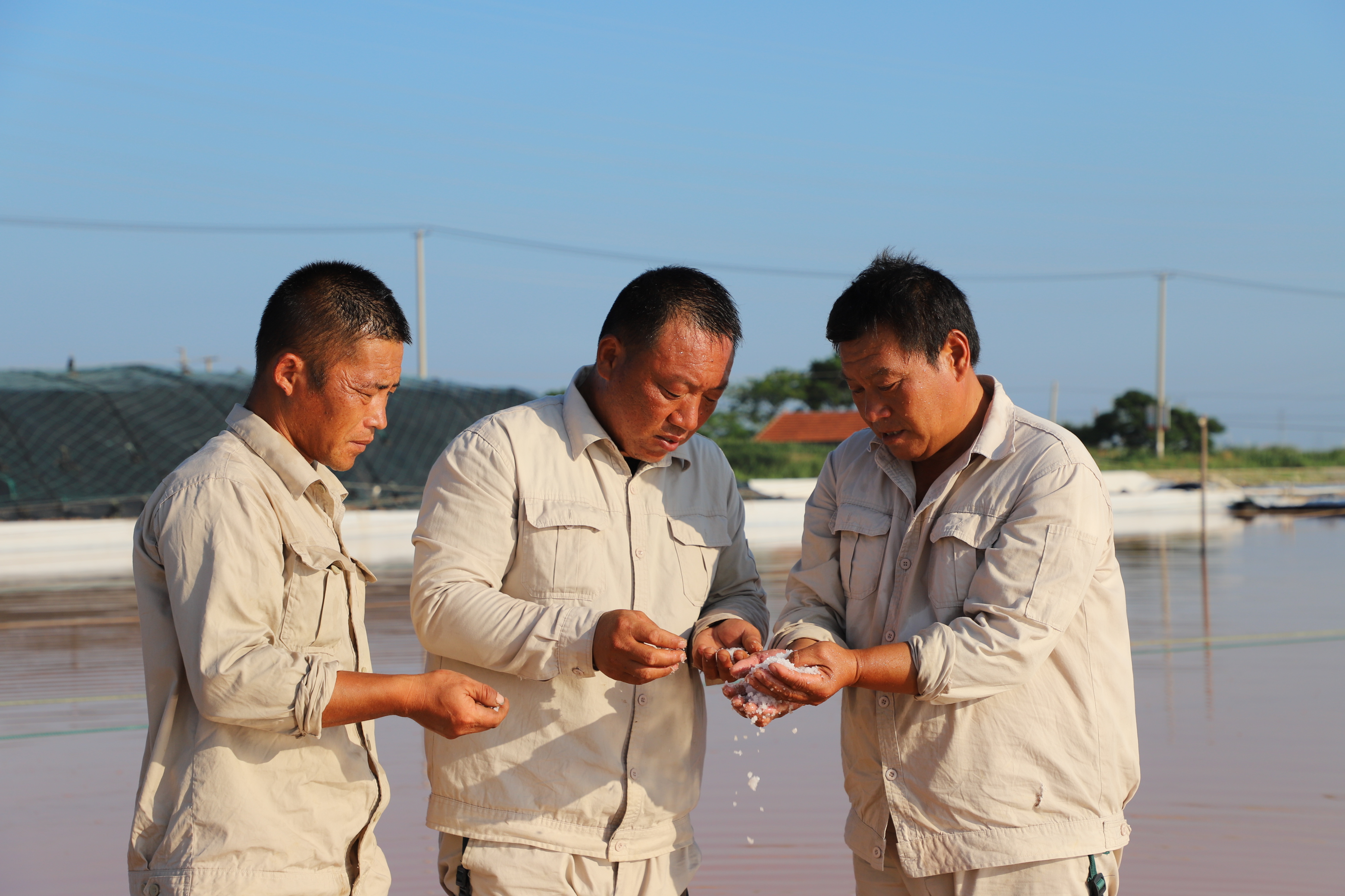 “氣溫越高,鹽的蒸發量就越高,公司效益就好,按今年的產鹽趨勢,超額完成公司指標任務應該不成問題,我們工人心里也高興呀!”勞模祝星星擦著臉上的汗珠自豪的說道。“晴天一身汗,雨天一身泥”是制鹽人的家常便飯,為確保汛期安全生產,避開高溫時段作業,凌晨五點鐘,工人們已忙著鹵水除硫、維護收拉塑布收房系統、修補塑布……。鹽工身上的汗水與鹵水交織在一起,浸濕了工作服,透過驕陽他們黝黑的臉龐顯得越發的锃亮。