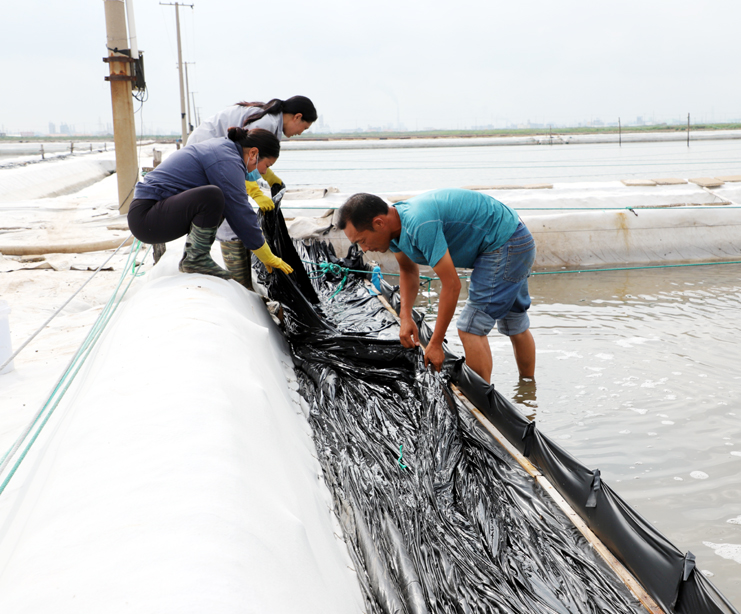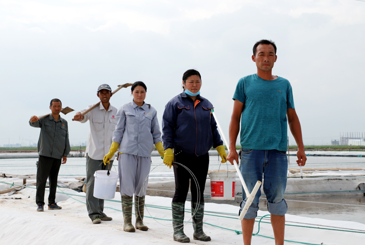 8月15日早,在制鹵區2班,班長王春好帶著班組的工人準備干活,安排好每個人的工作后,大家拿起工具上灘,工人們分散開來,各自忙著手里的活。工人們前后排開,彎腰俯身,用鐵鍬挖溝做堰,為下雨排淡水做好準備。“踩在鹵水里能感覺像是在“燙腳”,太陽把鹵水曬的滾燙的。”領灘手王春好用衣袖擦著臉上的汗水說,自己在灘上干了有七、八年了,對于這樣的工作環境已經適應了。進入八月以來,連續7天最高溫度達到35以上,臺風過后,今天的氣溫也達到了33度,令今年這個夏天,成為有完整氣象記錄最熱的夏天。跑水工仇海濱,到灘上一個多小時,以是大汗淋漓,他帶領工人做一些修堰、補塑布、緊繩、還有查跑道頭的活。