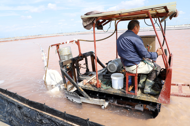 筆者在走訪時看到,在新河制鹽分公司10班的鹽池內,一臺輕型自吸式電動履帶“T30”正在進行帶鹵扒鹽,大池道上抽鹽機泵的轟鳴聲回蕩在鹽灘上,不遠處另外幾個扒鹽機組也在不停的忙碌著。