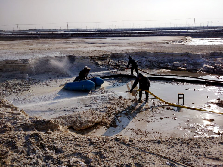 來到埒南制鹽分公司6班硫酸鈣清理現(xiàn)場,只見水槍里射出的水柱把硫酸鈣廢渣沖的四處飛濺,伴隨機(jī)器轟鳴聲硫酸鈣廢液被送出灘外,工友們穿好雨衣,戴好頭盔,手握水槍,一站就是3、4個(gè)小時(shí),他們兩人一組,輪番作業(yè),確保息人不息機(jī)。班長胡繼華信誓旦旦的說我們要發(fā)揚(yáng)一不怕苦,二不怕累的革命精神,發(fā)揚(yáng)“有條件要上,沒有條件創(chuàng)造條件也要上”的大慶精神,寧愿多加班,少睡覺也要按期保證完成硫酸鈣清理工作。