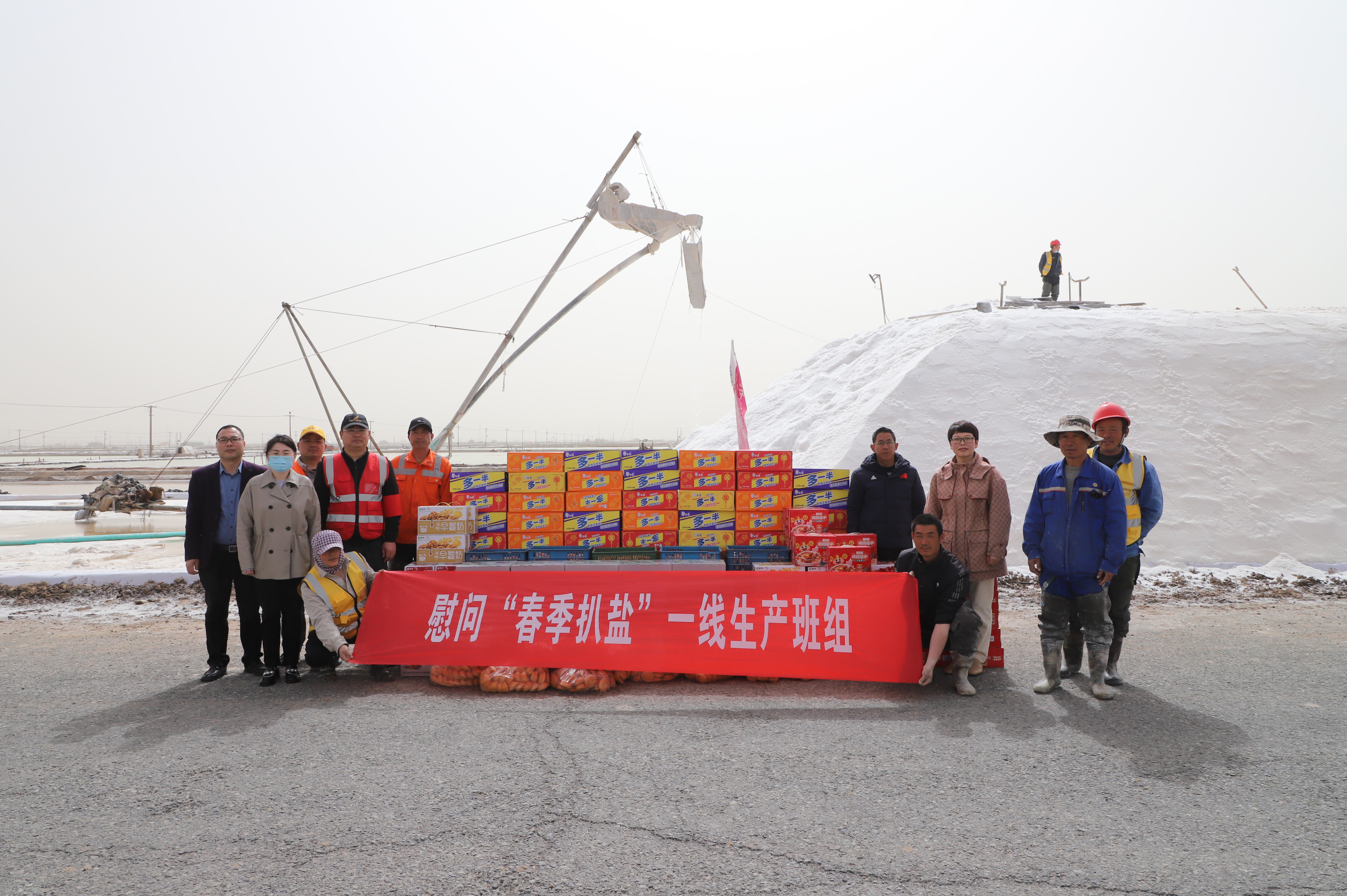 “你們辛苦了,我代表公司來看望大家。”在新河九班與埒南九班,王宏與扒鹽現場職工握手問好,感謝他們在過去的一年為日曬制鹽公司的原鹽生產所付出的辛勤努力,叮囑他們一定要落實落細扒鹽生產措施,增強責任感和警覺性,嚴格執行各項規章制度,切實保障扒鹽期間的安全生產,并送上雞蛋、八寶粥、方便面、牛奶等物品。