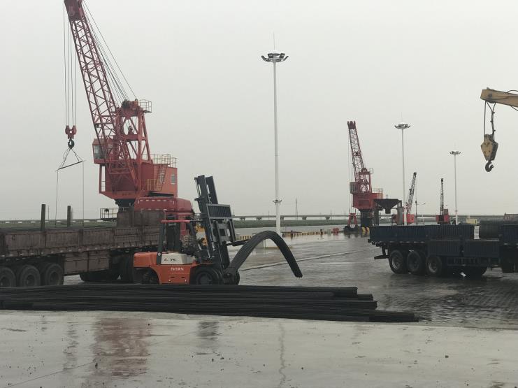 “戰高溫,迎酷暑”,宵洋碼頭從早上開始就忙得如火如荼。裝載管樁的貨船進入碼頭,工人們就開始操作著塔吊,穩穩當當的將管樁“放”入貨車。貨車裝載的盤螺,鋼筋也紛紛到碼頭場地上裝卸。一切工作都井然有序的進行著。