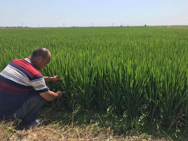 圖為二灣分公司靳國友正在查看自己管理的責任田水稻生長情況。