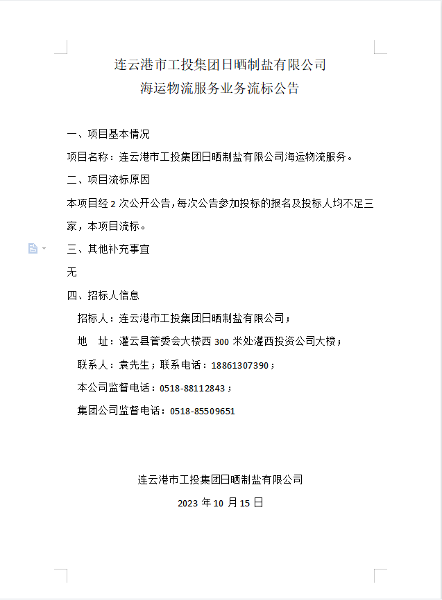 連云港市工投集團日曬制鹽有限公司海運物流服務業務流標公告
