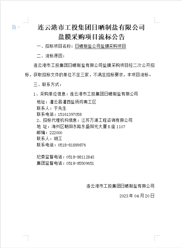 連云港市工投集團日曬制鹽有限公司鹽膜采購項目流標公告