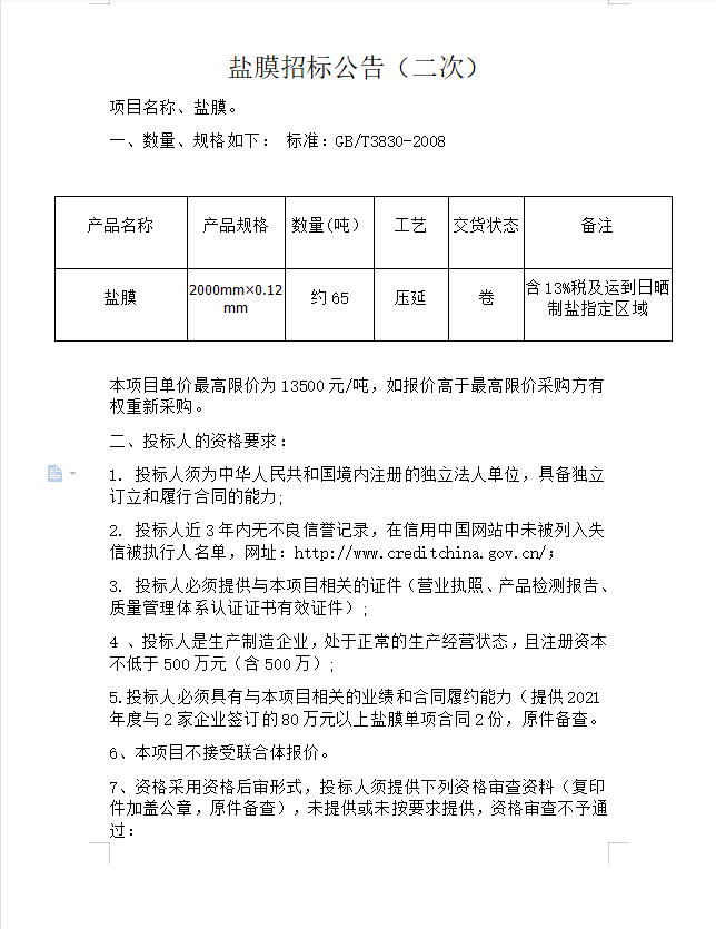 鹽膜招標公告(二次)