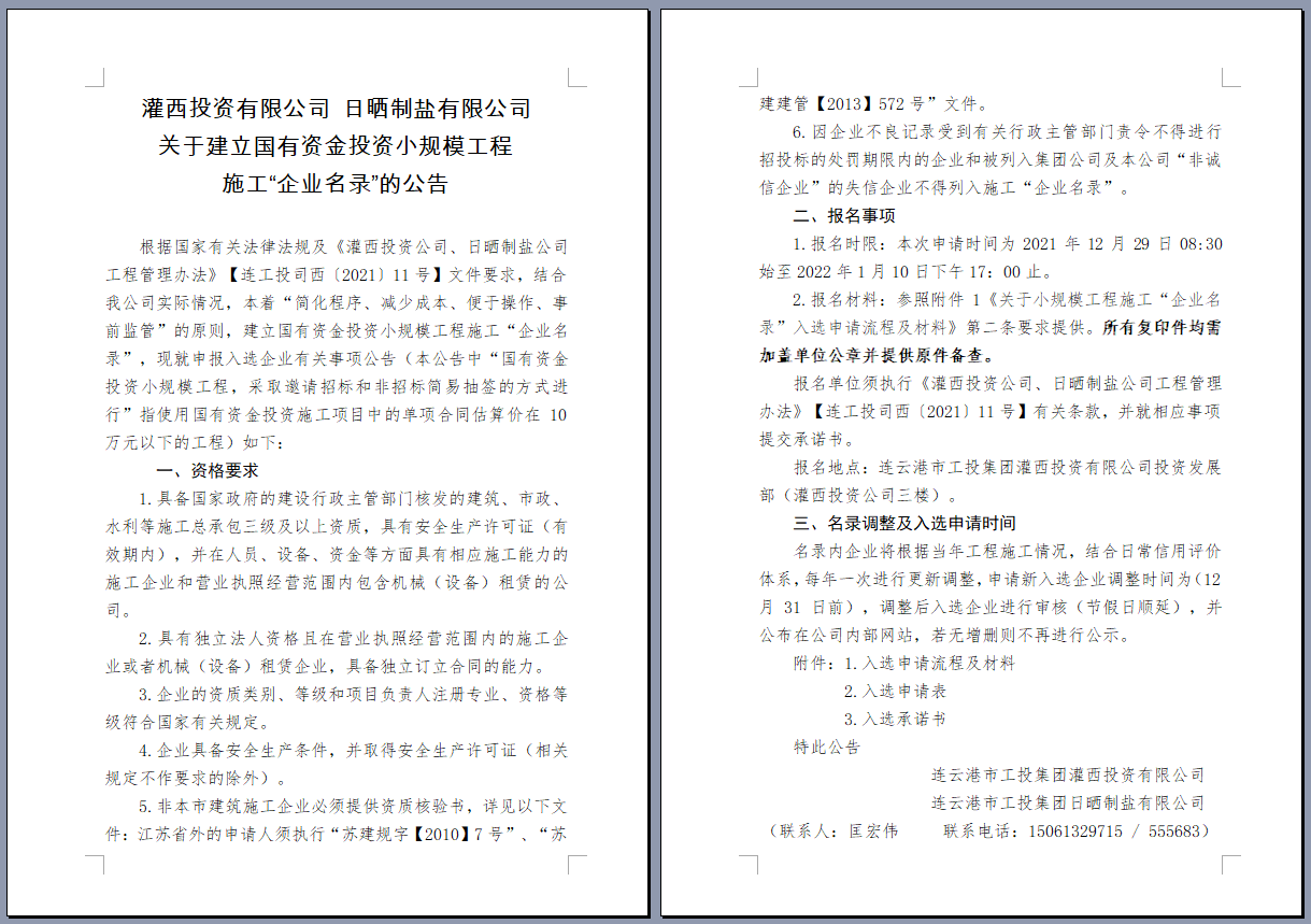 關于建立國有資金投資小規模工程 施工“企業名錄”的公告