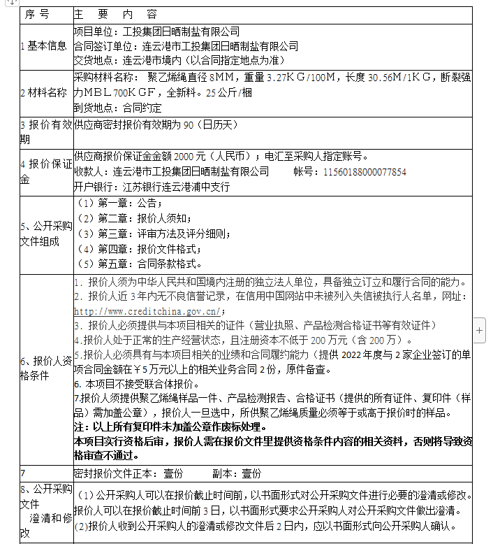 聚乙烯繩公開(kāi)采購(gòu)公告