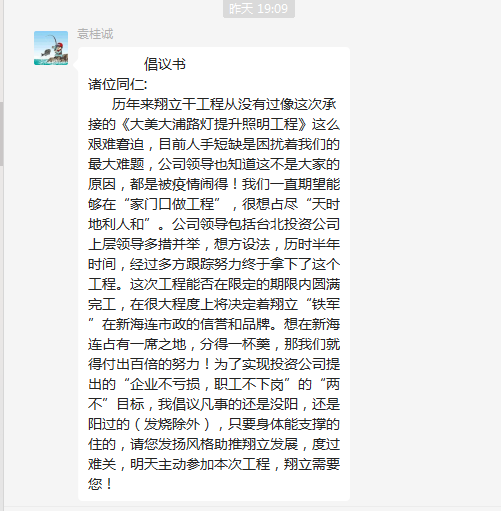 ? ? ? ??運(yùn)籌帷幄,統(tǒng)籌安排。每天早上7點(diǎn)多,都會(huì)看到翔立廠房前的靚麗風(fēng)景線,那是鐵軍們正在進(jìn)行早班會(huì):強(qiáng)調(diào)工作需要注意的安全點(diǎn),進(jìn)行現(xiàn)場分配工作,互相鼓勵(lì)打氣,充分調(diào)動(dòng)大家的積極性;晚上結(jié)束一天勞累的工作,鐵軍們也沒有閑著,在工作群中熱烈的討論工作情況,大家心往一處想,勁往一處使,彼此間相互鼓勵(lì),努力高質(zhì)量的完成路燈工作。雖然疫情影響減員嚴(yán)重,但是大美大浦亮化工程,7條主干道,翔立已經(jīng)完成了6條,大浦路需要把路燈上的方管變成圓管,才能進(jìn)行更換,翔立分公司未雨綢繆,及時(shí)聯(lián)系廠家送來配件,確保工程不停工。