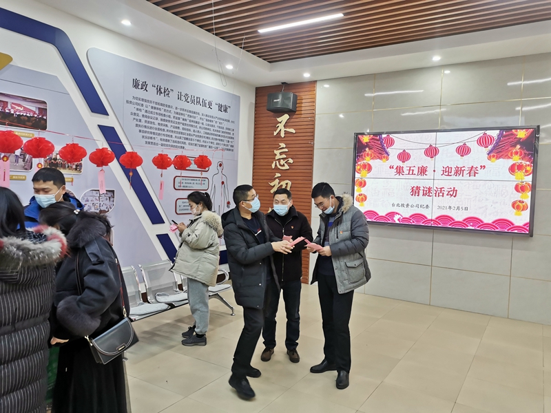 五廉迎新春,自律過佳節(jié)。公司紀(jì)委將黨風(fēng)廉政建設(shè)與節(jié)前休閑教育相結(jié)合,以猜謎的形式引導(dǎo)廣大黨員干部增強黨紀(jì)黨規(guī)意識,筑牢節(jié)日廉潔防線,有效營造出清正和諧的從業(yè)氛圍,為公司新一年轉(zhuǎn)型發(fā)展再添“廉”動力。