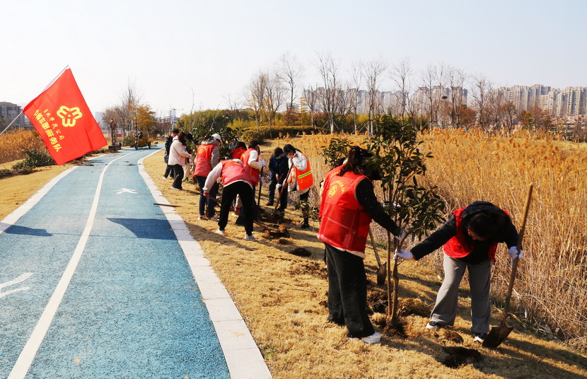 ? ? 都說女人能頂半邊天,不僅在工作上獨當一面,掄起鐵锨來也有“女漢子”的風采。在植樹活動中,女職工們齊心協力,有的搬運樹苗、有的挖坑育樹、有的培土澆水,大大小小百余棵樹木很快就玉立在昌圩湖公園健康小路兩側,為昌圩湖公園增添了一份綠意。