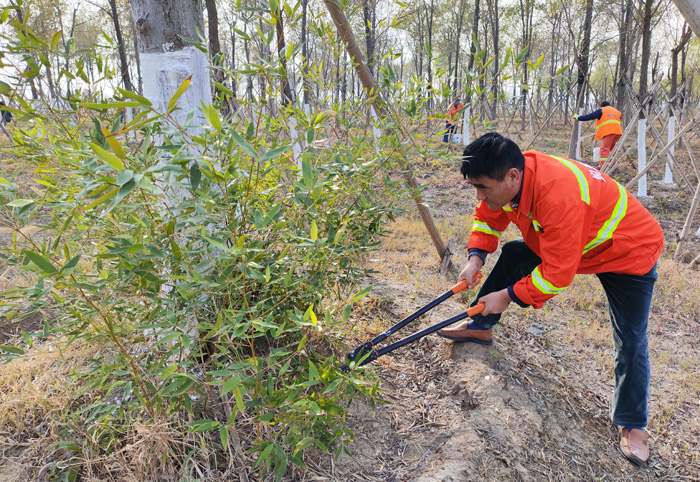 當(dāng)前,為扎實做好冬季樹木養(yǎng)護(hù)工作,提高樹木的過冬、抗病和抗蟲能力,李傳武帶領(lǐng)班組全員開展樹木涂白行動,悉心為樹木披上“防寒衣”。為達(dá)到同一標(biāo)準(zhǔn),他采用“立桿涂白法”,首先安排專人進(jìn)行劃線,將行道樹涂白高度統(tǒng)一控制在1.2米,使區(qū)域內(nèi)涂白高度保持一致,確保樹木涂白效果與植物整體美觀,經(jīng)過10天的持續(xù)工作,完成10000余棵行道樹涂白工作(完成工作量約20%)。