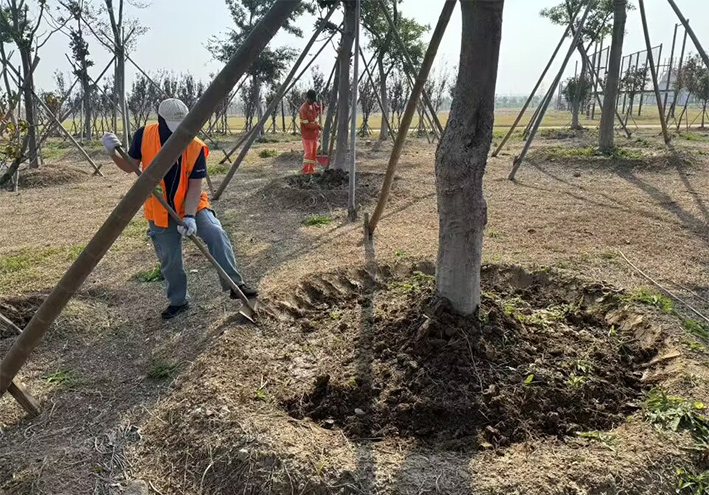自十月中下旬以來,班組全體成員積極準(zhǔn)備,做好抗旱保障工作。每天早晨7點(diǎn),兵分二路,按照各自分工迅速行動起來。葛承東帶領(lǐng)一部分工人對櫻花林、紅梅林整理樹圍;田恒亮帶領(lǐng)一部分工人施肥澆水,有的同志拎小提桶施肥,有的拿自來水管在后面澆水。為保證水流進(jìn)樹木根系,工作人員采取多種方法讓葉片、根系喝足水。為堅(jiān)決打贏這場抗旱保樹木攻堅(jiān)戰(zhàn),綠化分公司在堅(jiān)持科學(xué)用水、節(jié)約用水的前提下,通過科學(xué)的修剪植物、抹芽,松土,除草等措施確保苗木安全度過干旱天氣。由于抗旱工作啟動較早,措施得當(dāng),抗旱保苗工作已取得初步成效。目前為止,已經(jīng)完成7000余棵櫻花林和紅梅林的施肥、澆水工作。